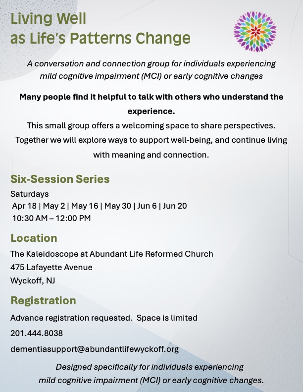 A reminder that we have a new support session for people beginning to experience mild cognitive decline.